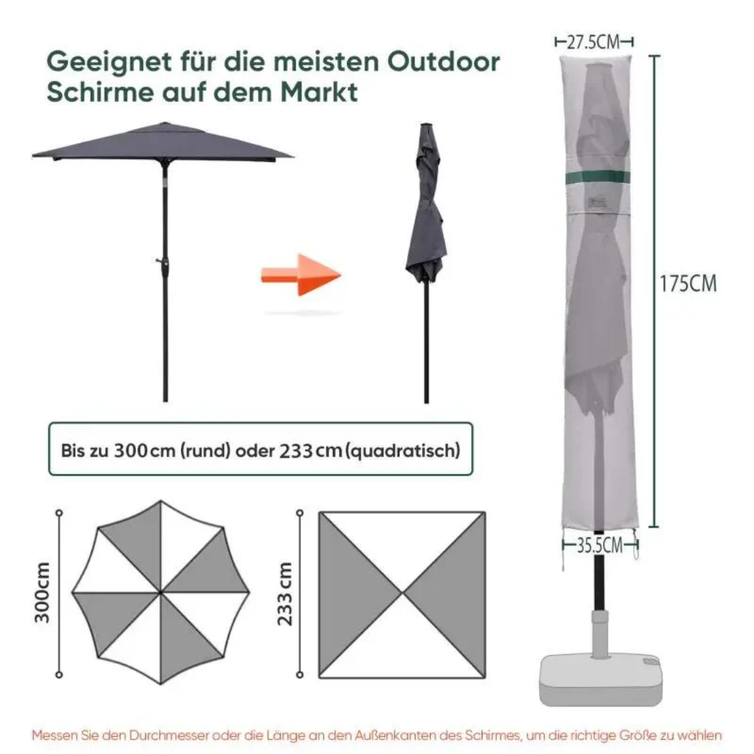 Mehrfachgrößen-Kompatibilität: Die Sonnenschirmhülle (175 x 27,5/35,5 cm) passt perfekt für Sonnenschirme bis zu Ø 300 cm und rechteckige Sonnenschirme bis zu 233 cm Seitenlänge.