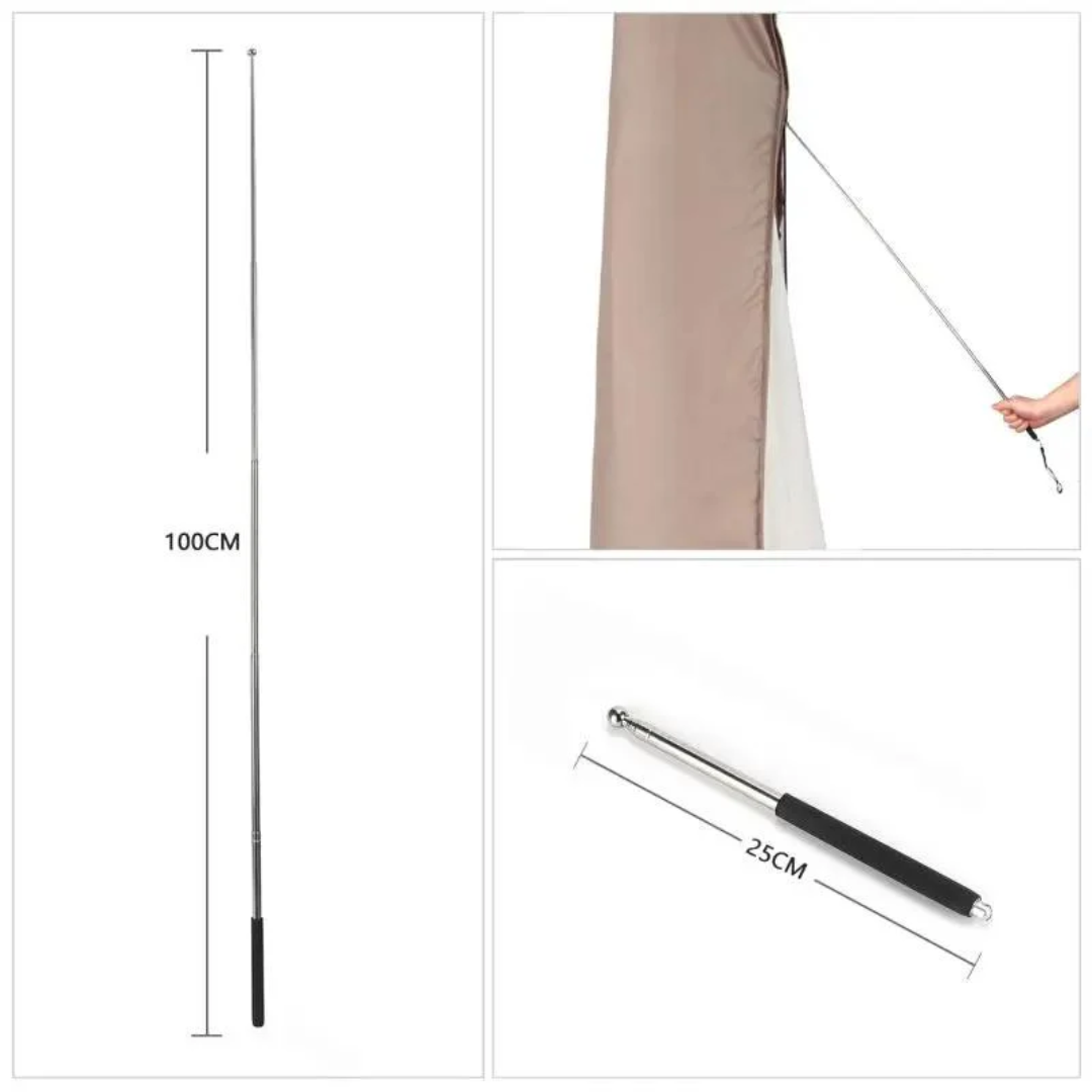 Praktische Handhabung: Der beiliegende Stab ermöglicht ermöglicht leiterfreie Installation. Er ist faltbar und kann während der Verwendung der Hülle platzsparend verstaut werden.