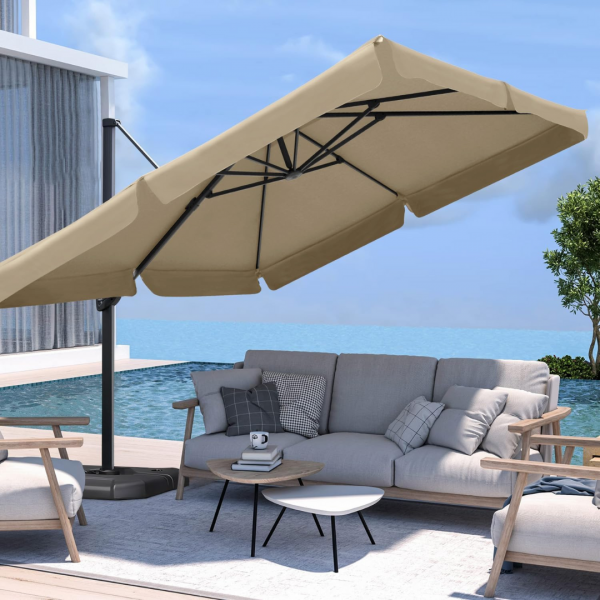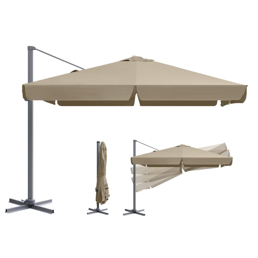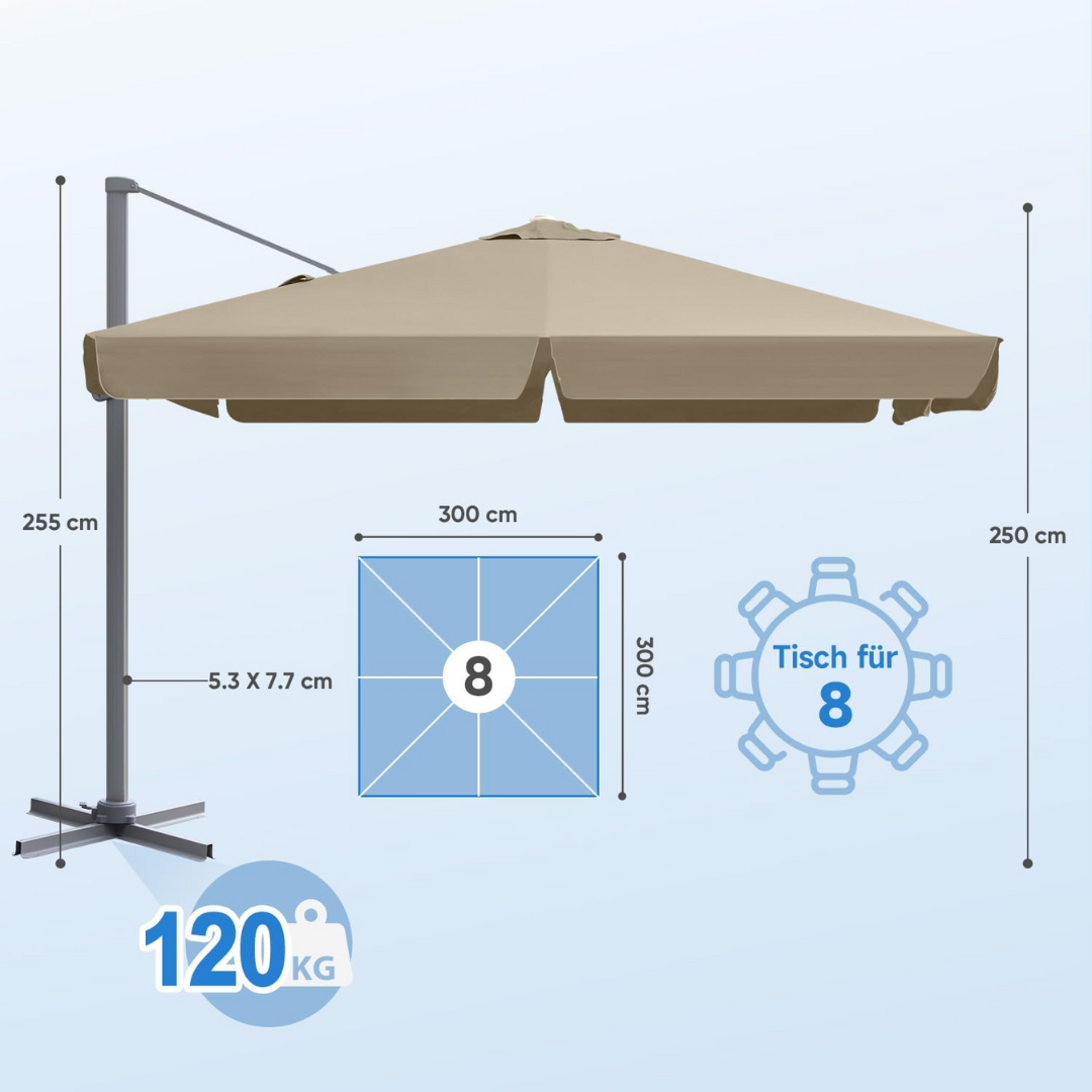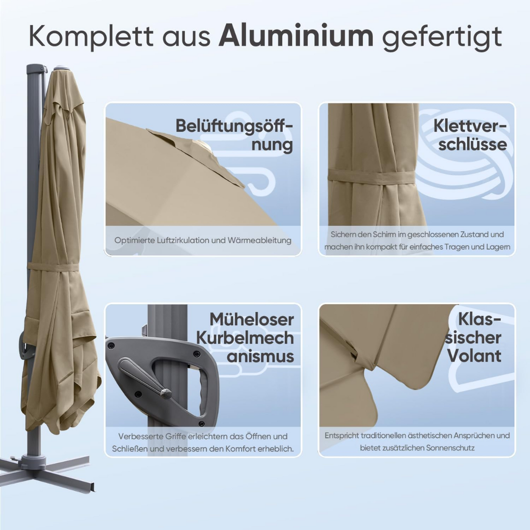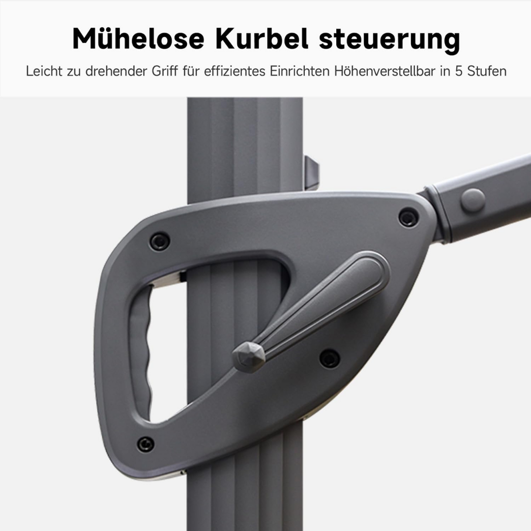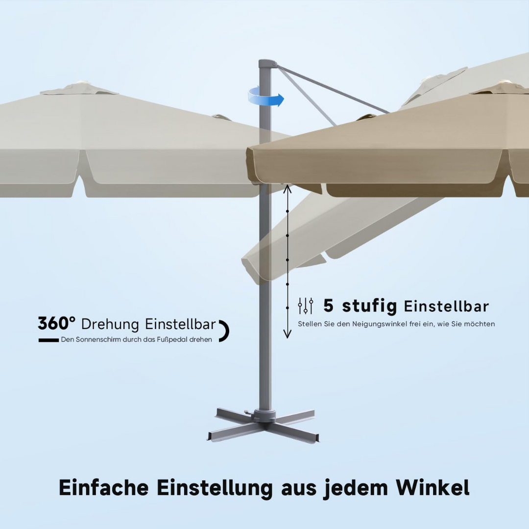 360° Rotation mit Fußpedal: Mit dem Fußschalter kann der Sonnenschirm mühelos um 360° gedreht werden, um optimalen Schatten zu jeder Tageszeit zu gewährleisten.
