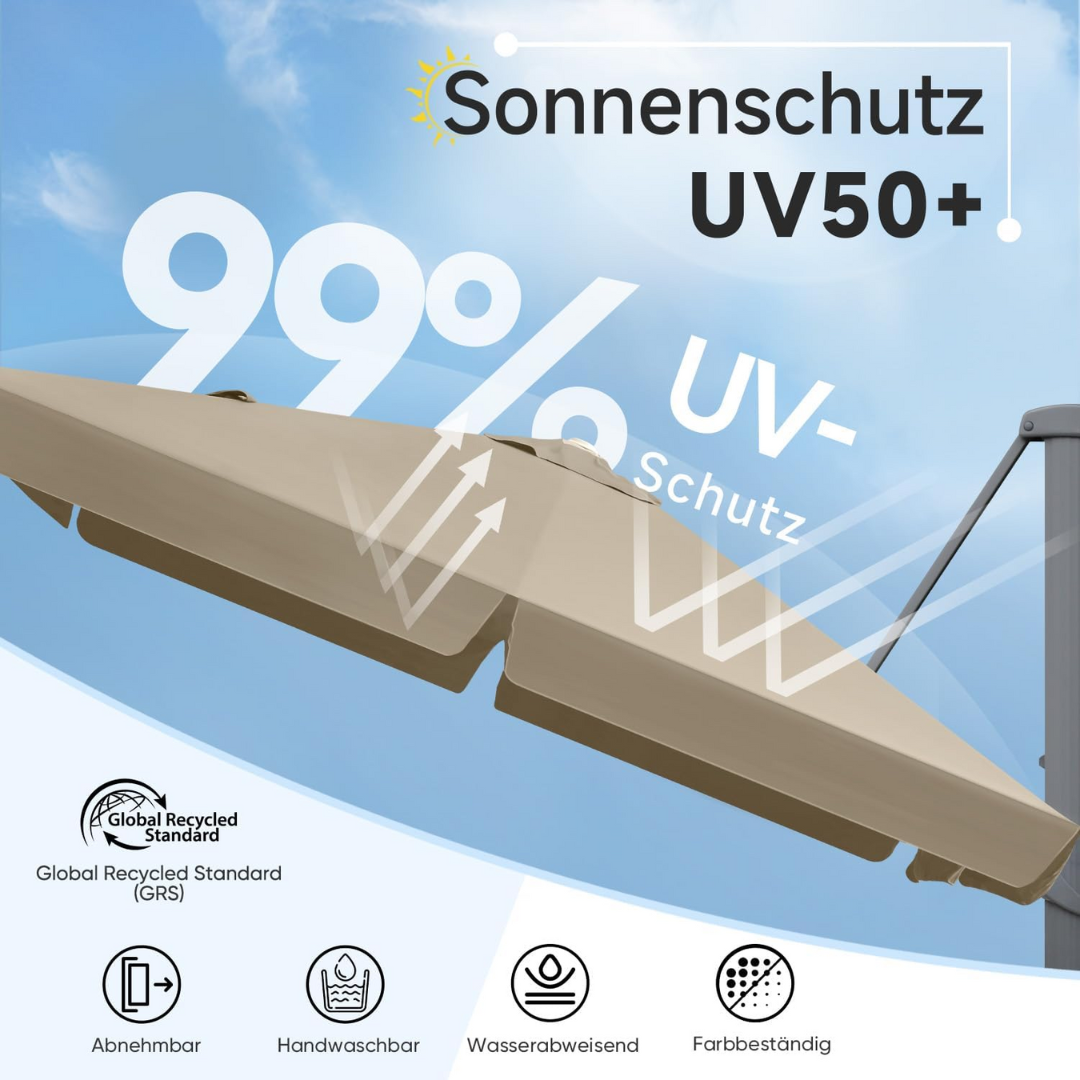 Hochwertiger Stoff: Gefertigt aus 200 g/m² Polyester, bietet der Sonnenschirm einen UV-Schutz von 50+. Langanhaltender Schutz dank Wasserabweisung und Farbechtheit.