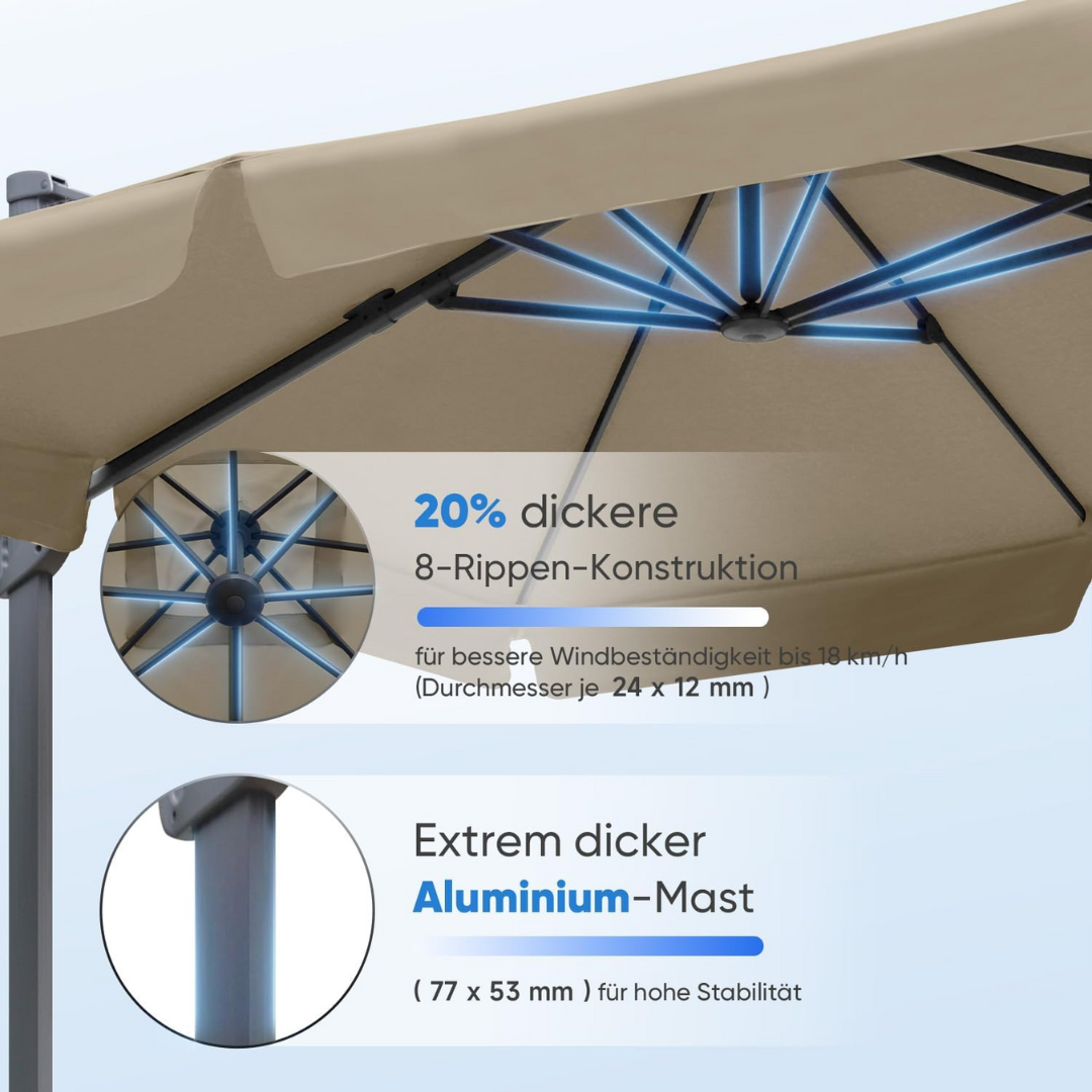 Stabile Struktur: Der Rahmen besteht aus robustem Aluminium und verfügt über 8 stabile Rippen sowie einen 53 x 77 mm großen, extradicken Schirmstock für maximale Stabilität.