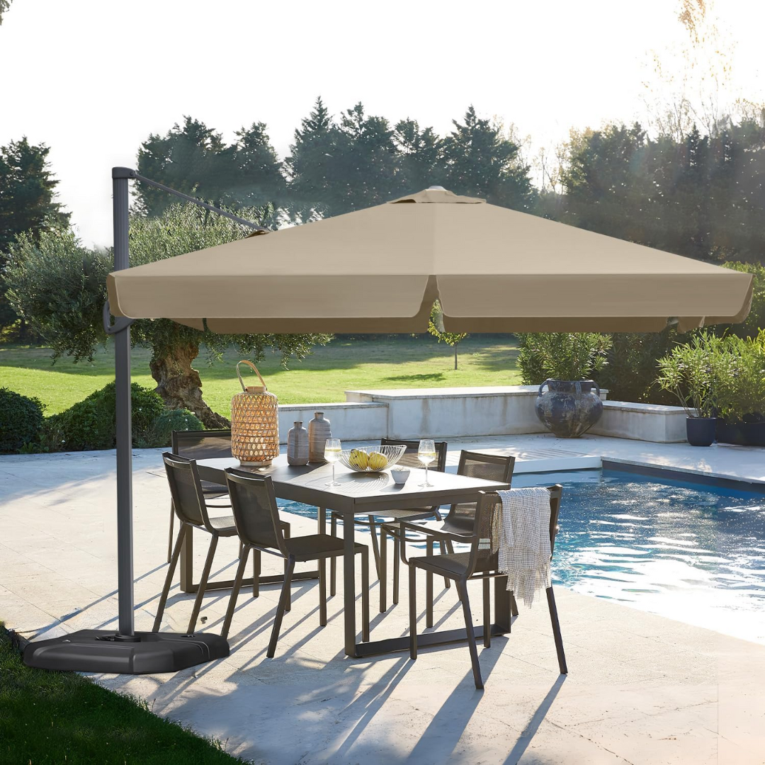 Praktischer Sonnenschutz: Gartenschirm mit großem Kreuzfuß für sicheren Stand. Eckiger Schirm bietet ausreichend Schatten für 8-10 Personen. Bei Nichtgebrauch platzsparend binden.