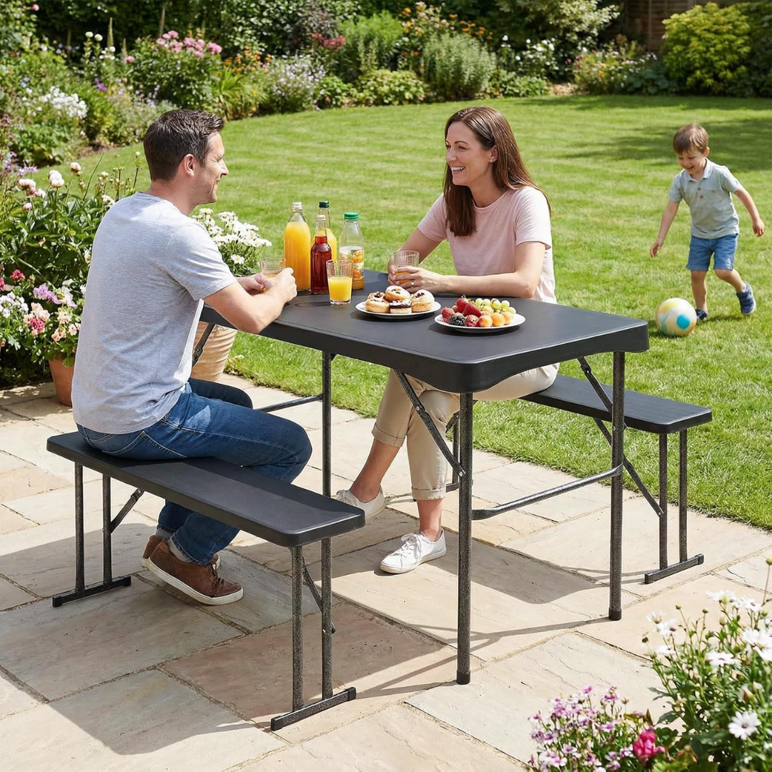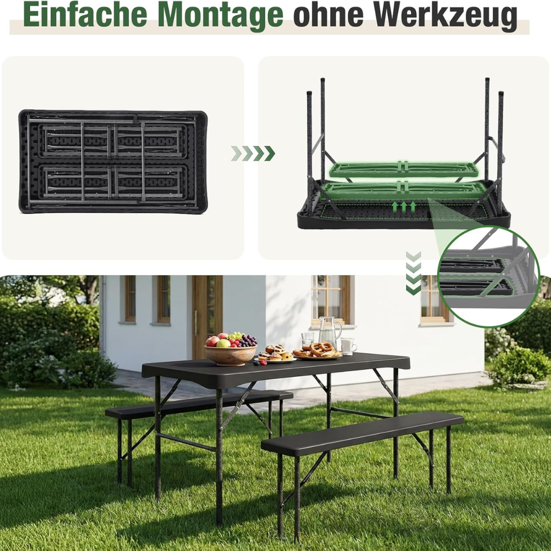 1. Tisch und Bänke lassen sich schnell zusammenklappen und verfügen über seitliche Tragegriffe.