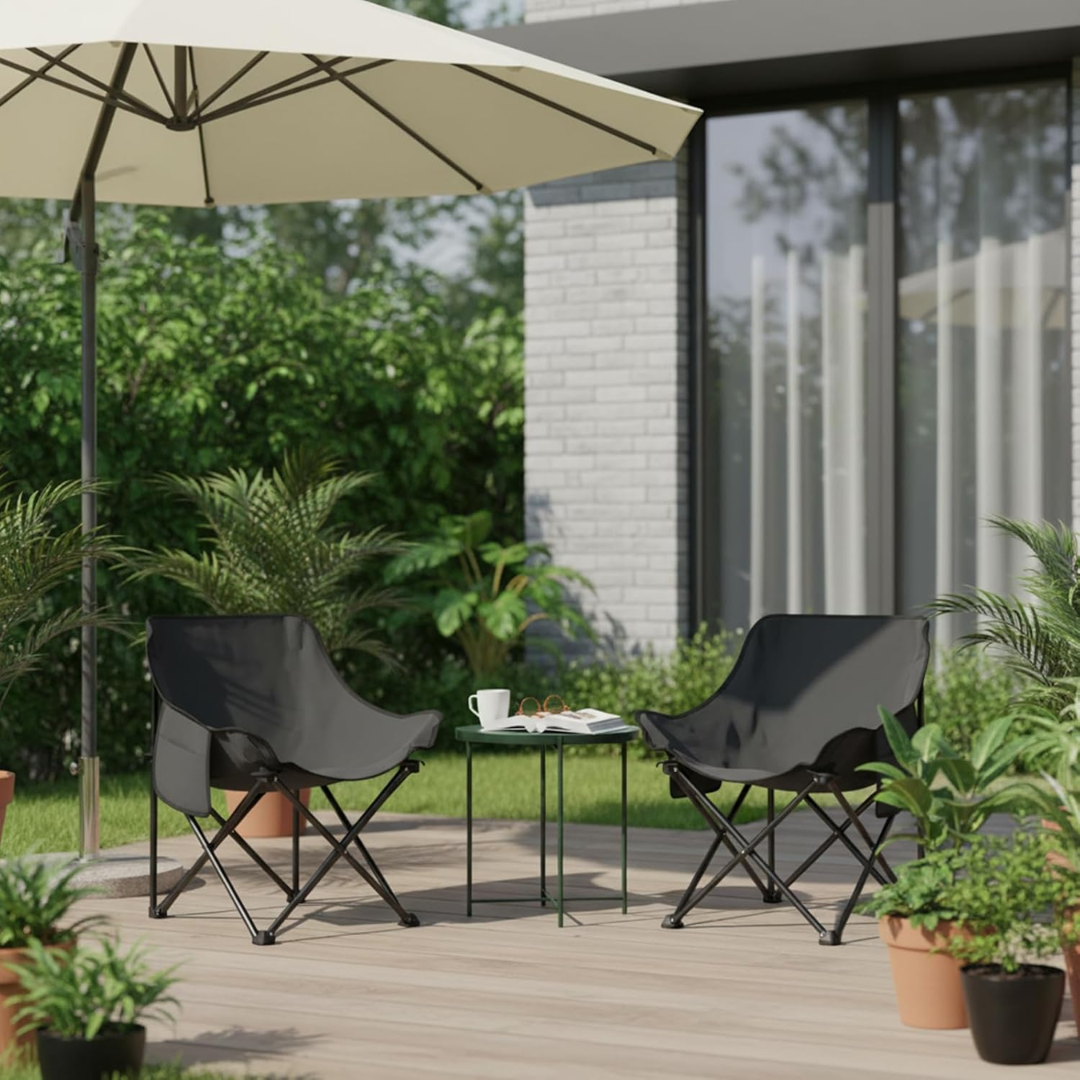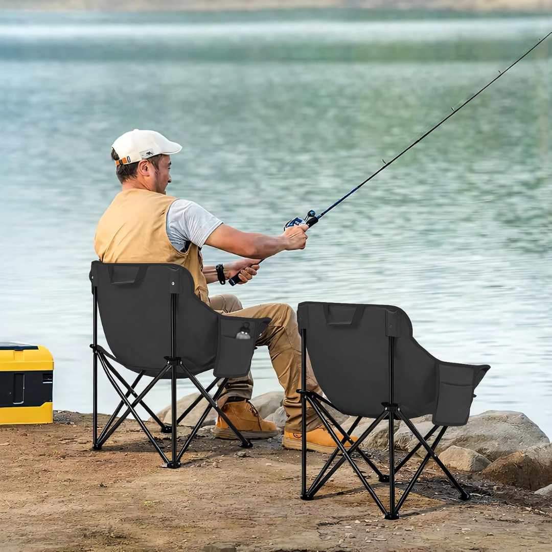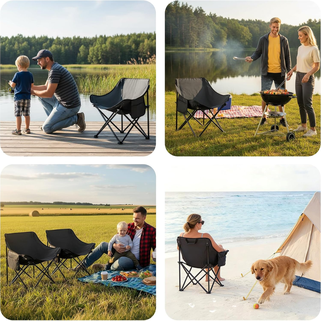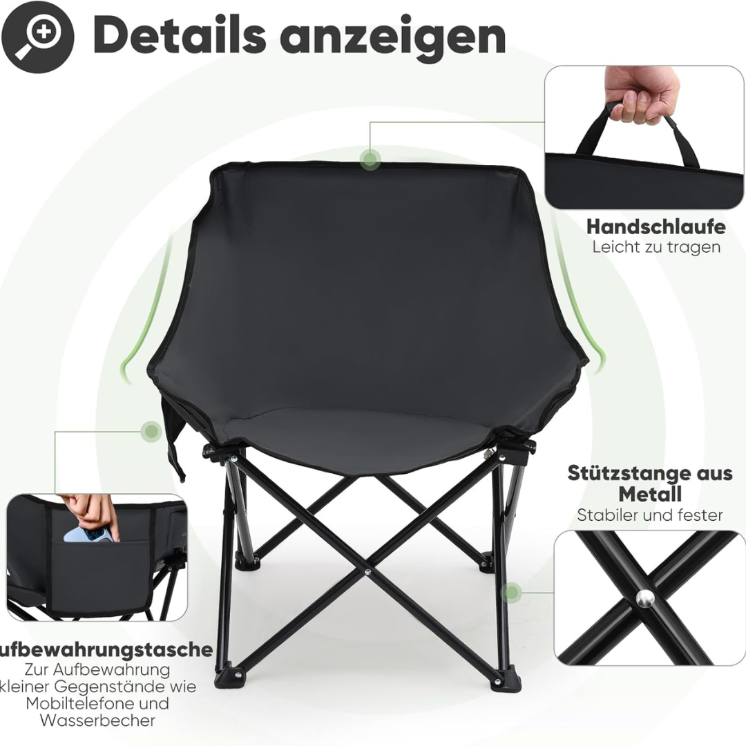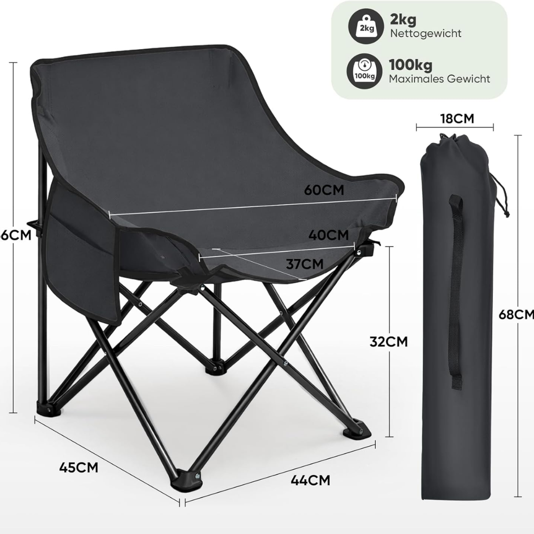 Das ergonomische Mondstuhl-Design unterstützt bequemes Sitzen über längere Zeit – ob beim Angeln, Picknick, im Garten oder am Strand. Verfügbar als Einzelstück oder 2er-Set für noch mehr Flexibilität.