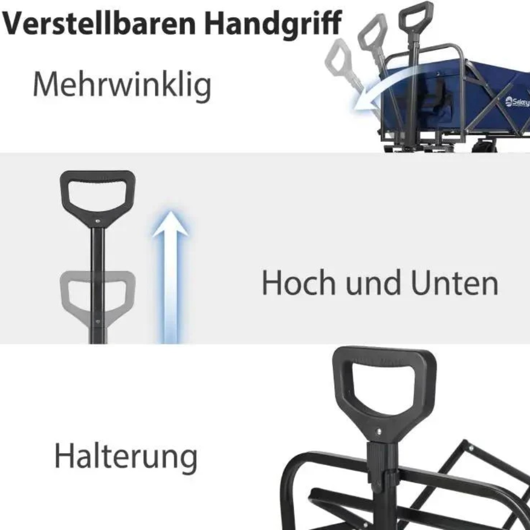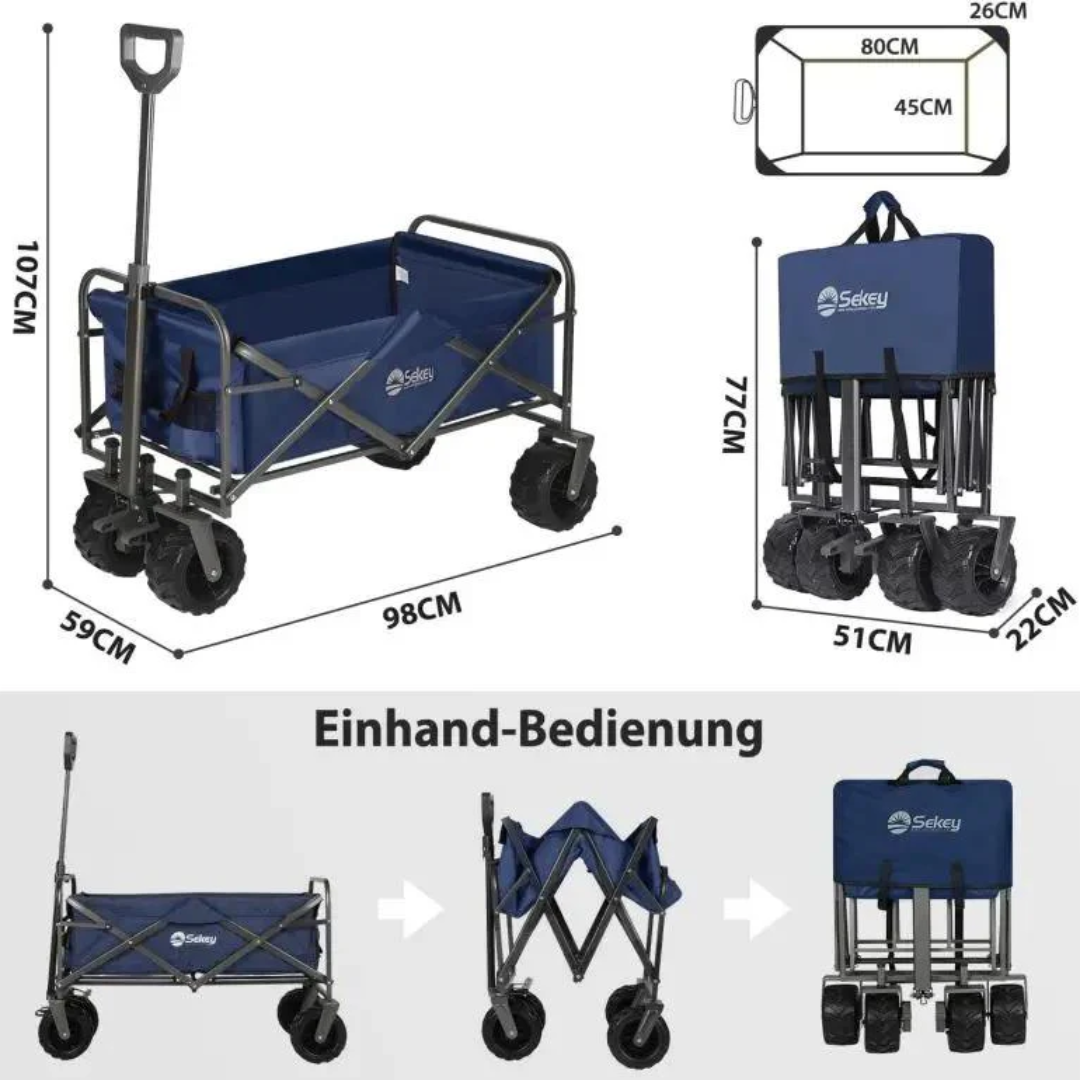 Enorme Belastbarkeit von 200KG: Egal, ob schwere Einkäufe, sperrige Gegenstände oder Campingausrüstung transportiert werden müssen, der faltbare Bollerwagen Sekey steht Ihnen immer zuverlässig zur Seite. Keine Kompromisse mehr bei der Ladung!