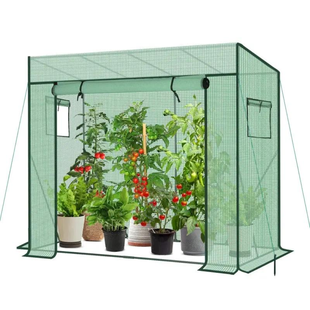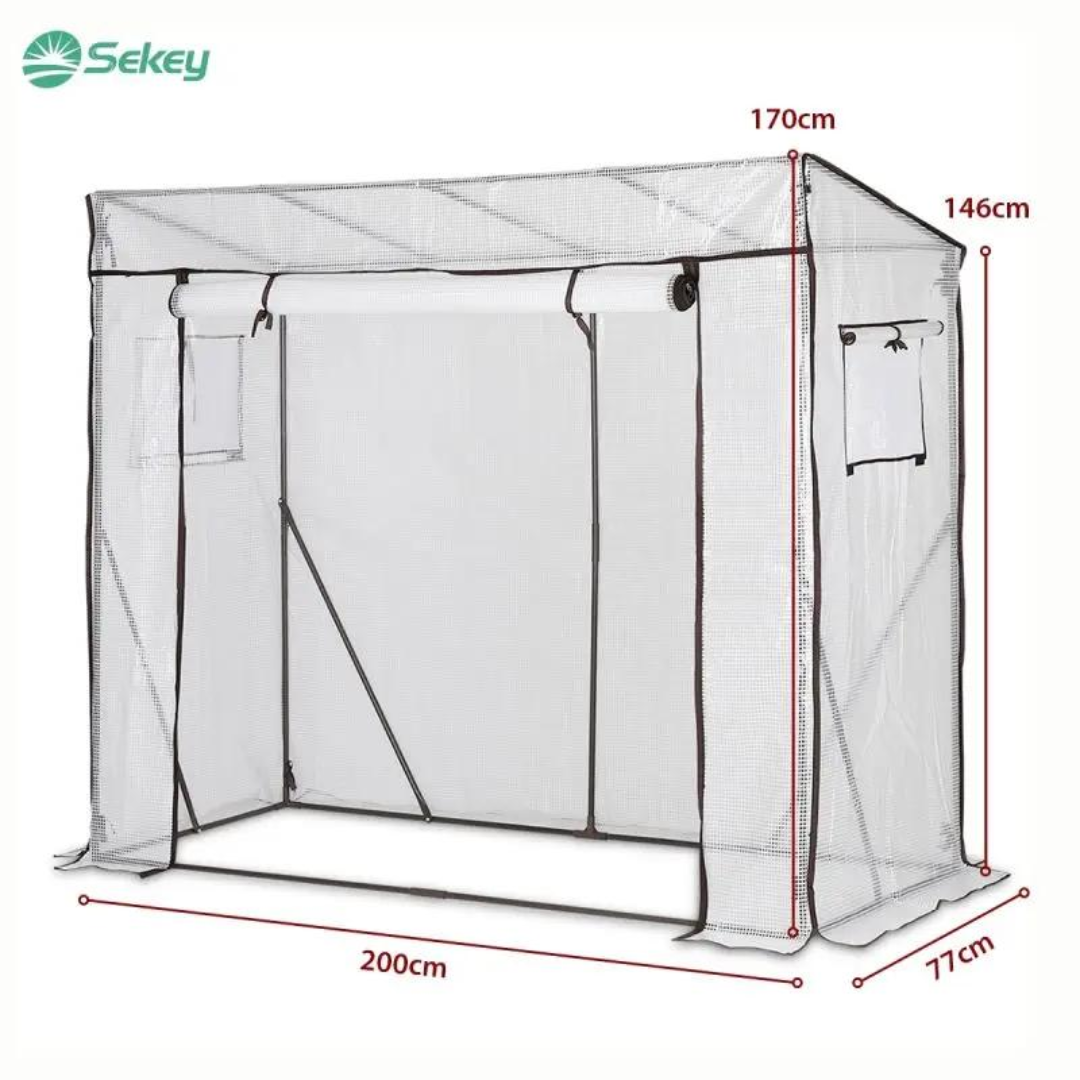 Das Gewächshaus ist mit einer Rolltür und Seitenfenstern ausgestattet, die einen einfachen Zugang und eine Belüftung ermöglichen. Die Innentemperatur kann durch den Reißverschluss leicht reguliert werden, um den Bedürfnissen verschiedener Pflanzen gerecht zu werden.