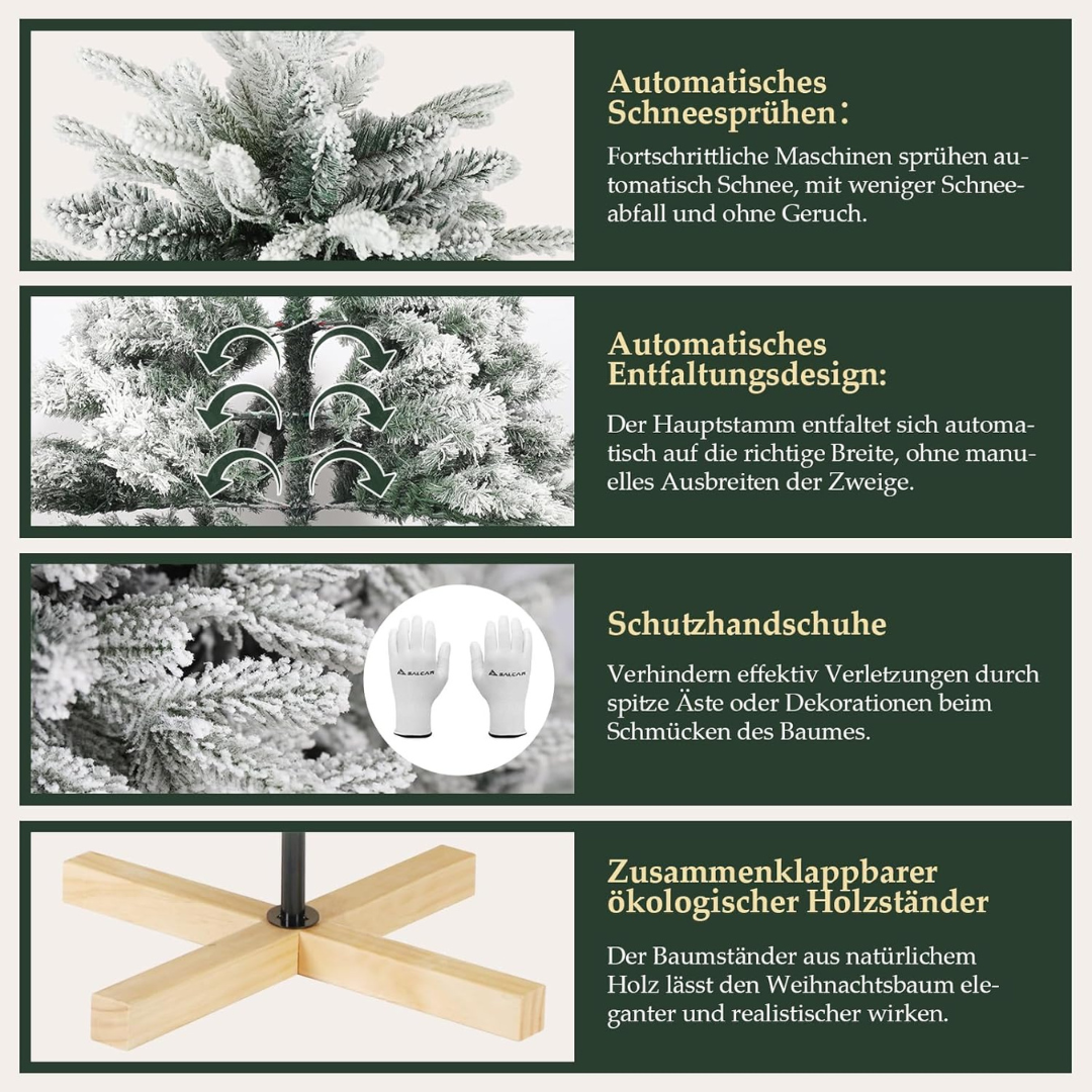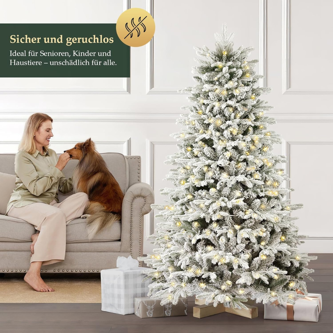 Sicher und benutzerfreundlich: Unser Weihnachtsbaum steht stabil auf einem robusten Holzsockel, ist dieser Baum sicher für Familien mit Kindern und Senioren. Die LED-Lichter sind frei von Feuerrisiken, sodass Sie sich entspannt zurücklehnen können.