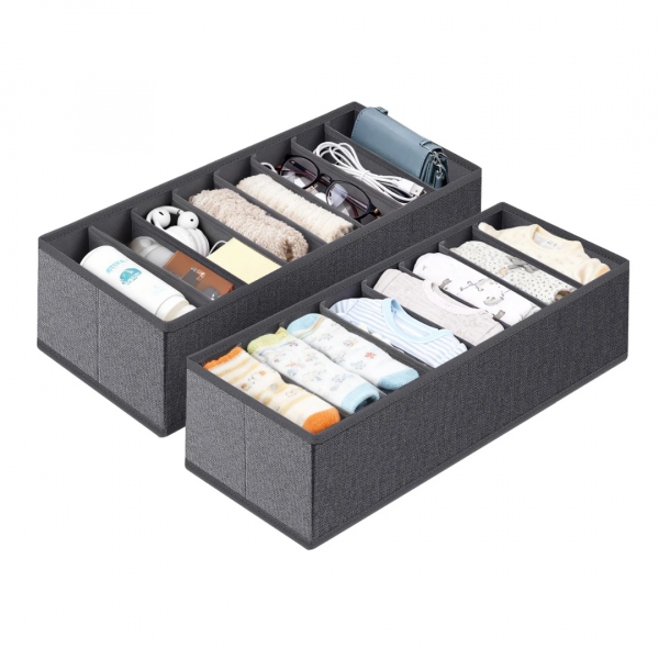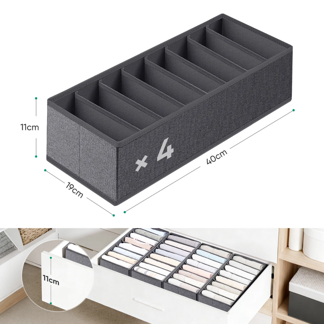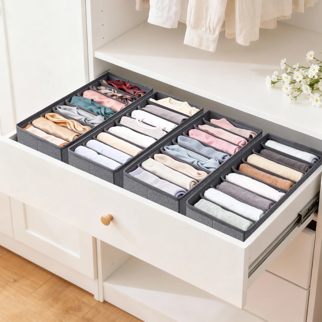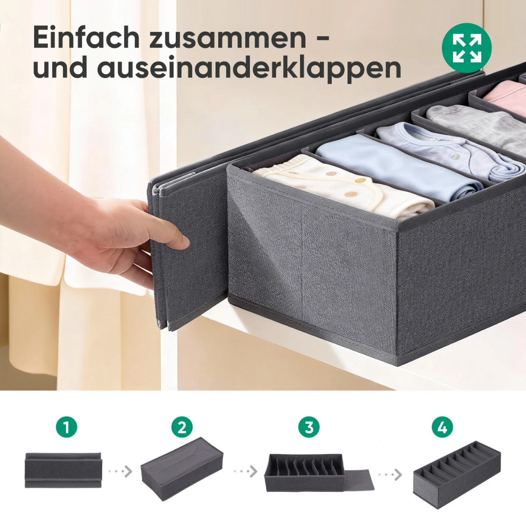 Dank stabiler Bodenplatten behalten die Boxen auch gefüllt ihre Form und lassen sich mühelos in Schubladen, Regale oder Kleiderschränke einsetzen. Das dezente Grau fügt sich harmonisch in unterschiedliche Wohnstile ein und sorgt für ein ruhiges, ordentliches Gesamtbild.