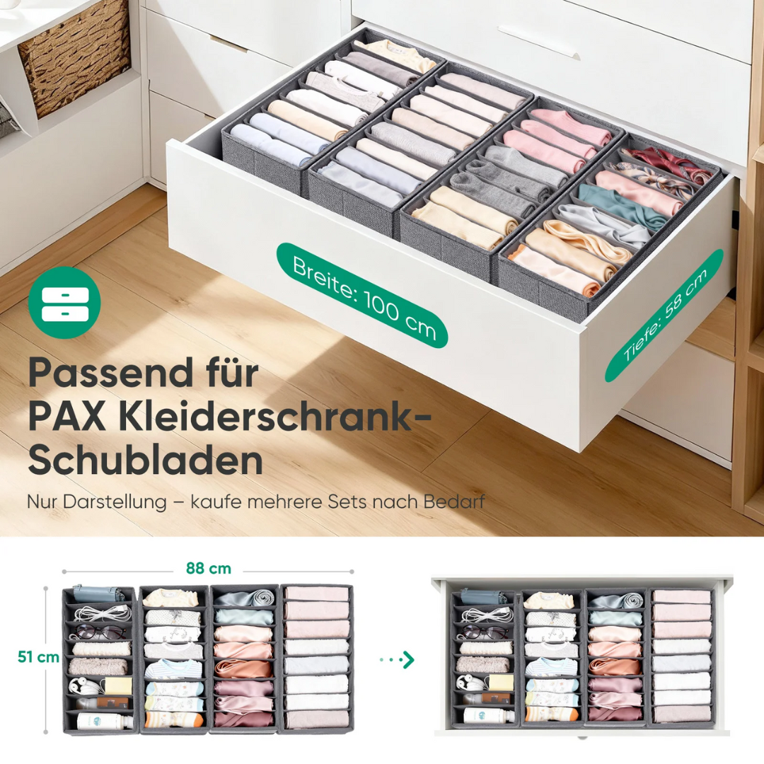 Bringen Sie Ordnung in Ihr Zuhause mit dem Sekey Schubladen-Organizer Set aus atmungsaktivem, formstabilem Vliesstoff. Die 8 separaten Fächer bieten flexible Ordnung für Unterwäsche, Socken, Accessoires oder kleine Alltagsartikel – alles griffbereit sortiert.