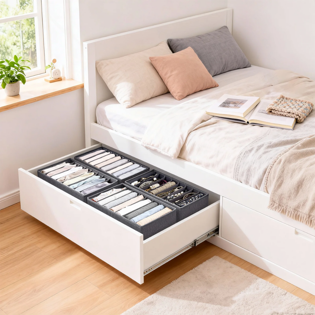Als 2er- oder 4er-Set nebeneinander genutzt, schafft das System eine übersichtliche Struktur, trennt Kategorien und erleichtert das tägliche Finden und Verstauen. Ideal für Schlafzimmer, Kinderzimmer oder Büro – so bleibt alles griffbereit und dauerhaft organisiert.