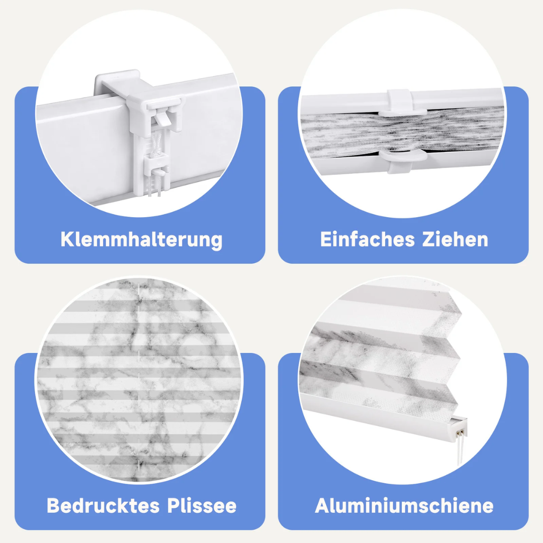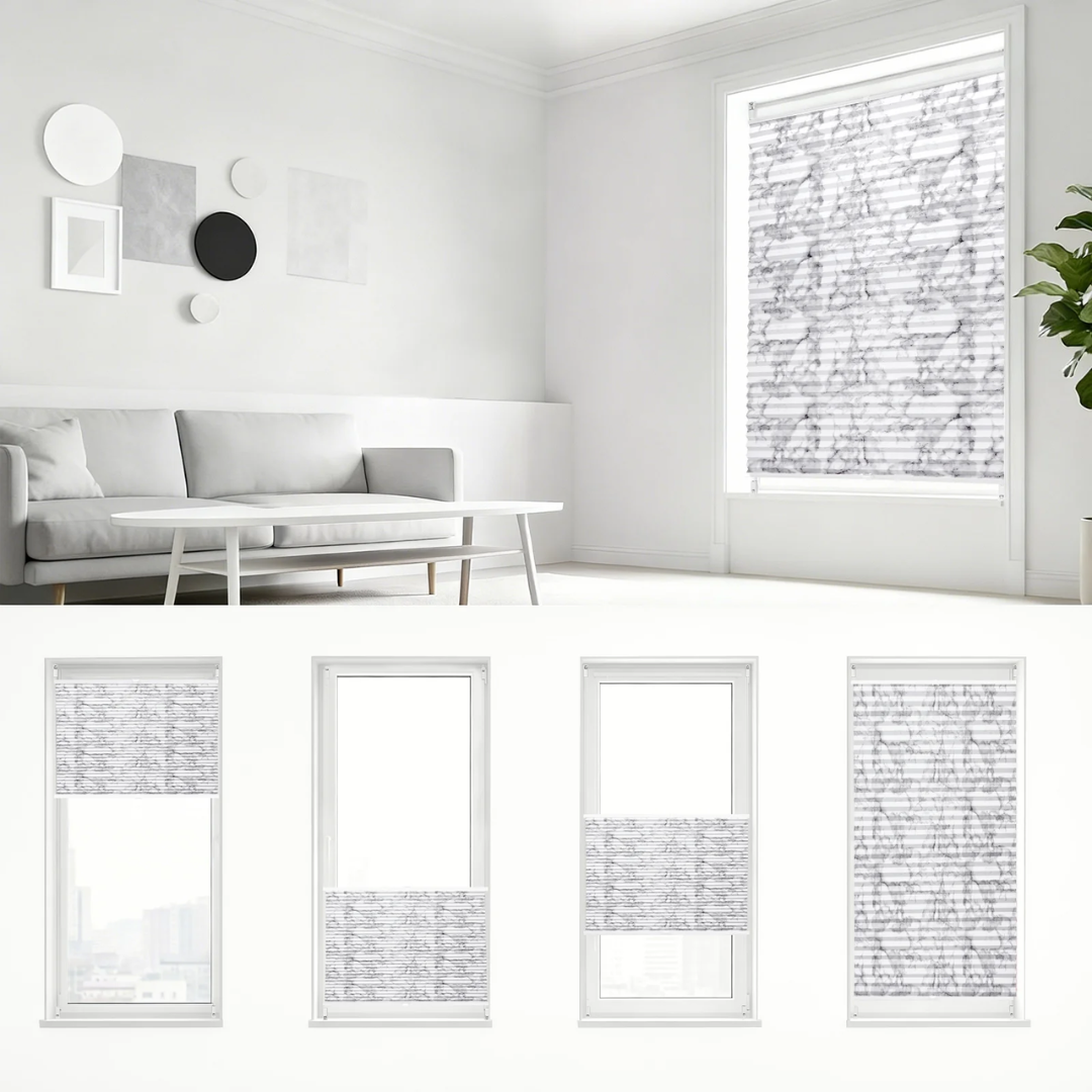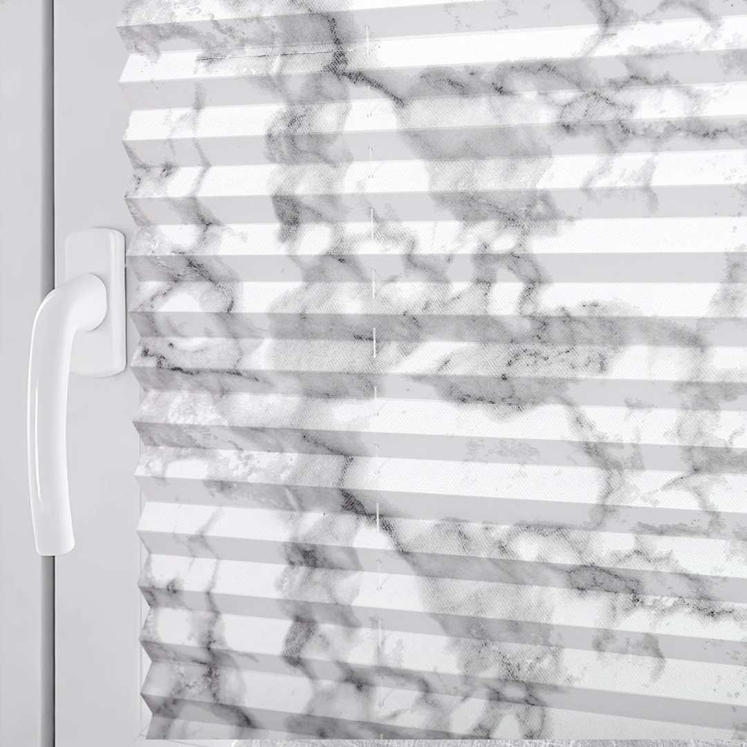 Das Sekey Plissee ohne Bohren in grauer Marmoroptik verbindet funktionalen Lichtschutz mit einer modernen, dekorativen Steinoptik. Das dezente Marmormuster verleiht dem Raum eine elegante Struktur und passt ideal zu zeitgemäßen Wohnkonzepten.