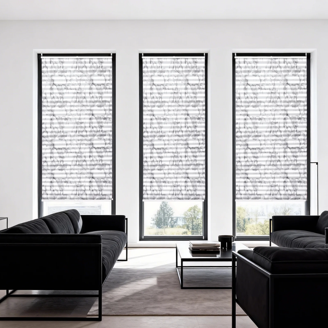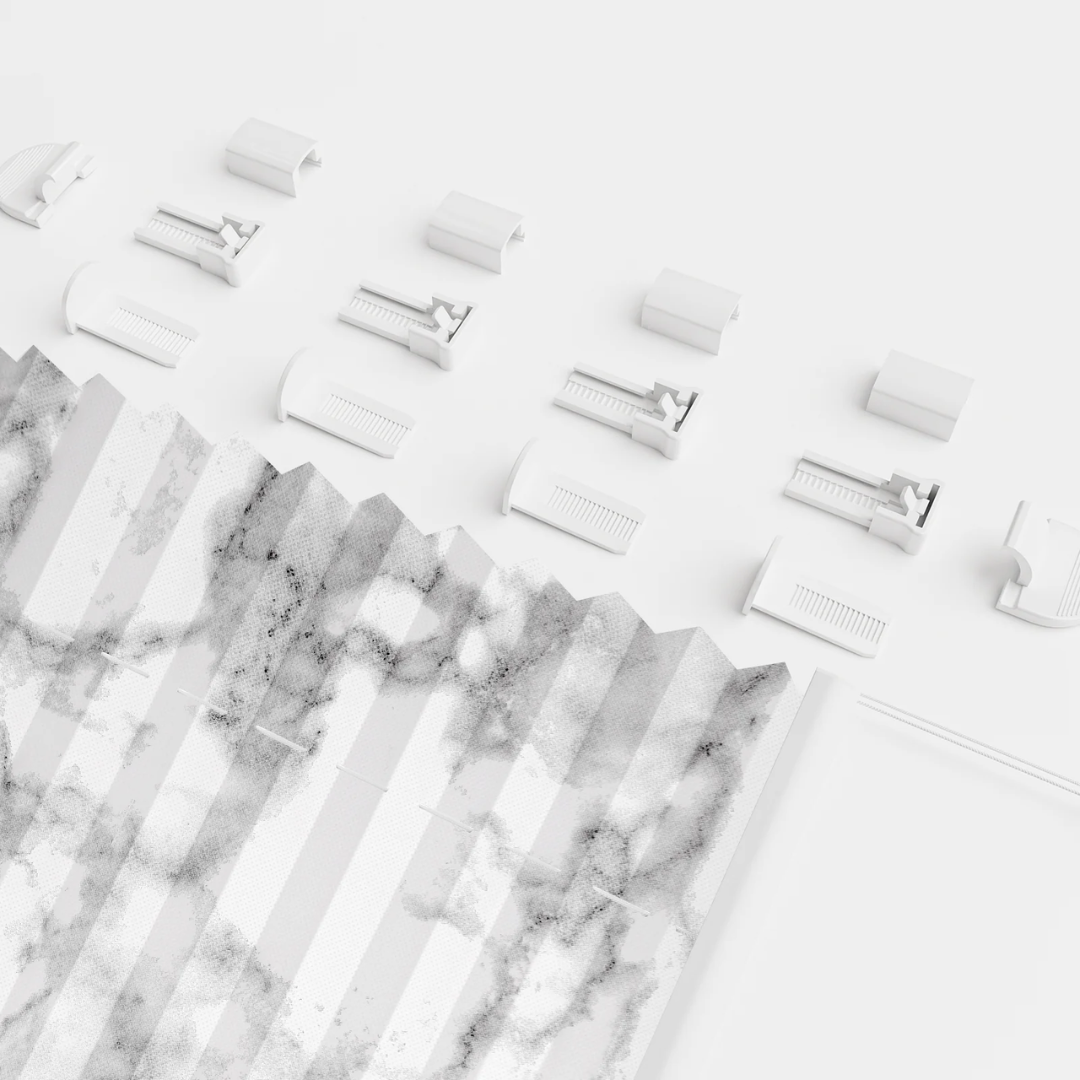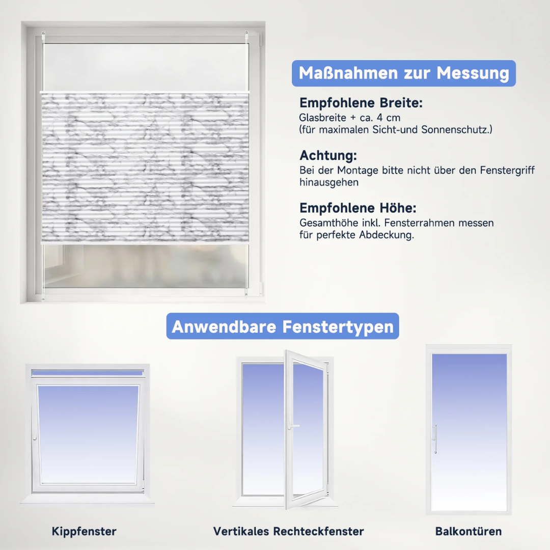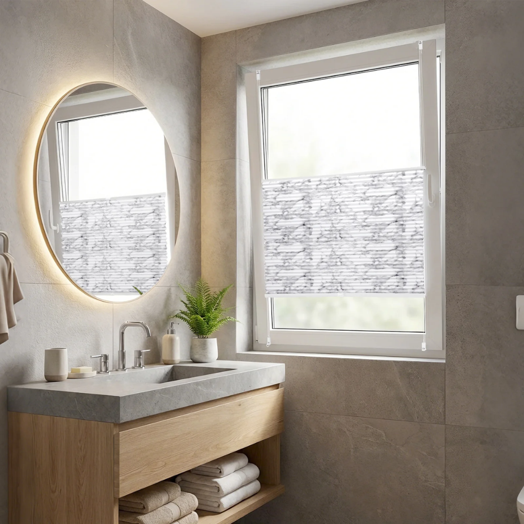 Das Sekey Plissee ohne Bohren in grauer Marmoroptik verbindet funktionalen Lichtschutz mit einer modernen, dekorativen Steinoptik. Das dezente Marmormuster verleiht dem Raum eine elegante Struktur und passt ideal zu zeitgemäßen Wohnkonzepten.