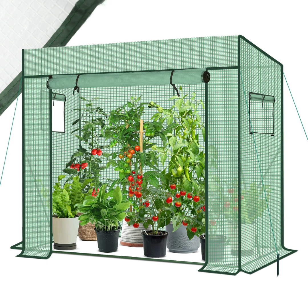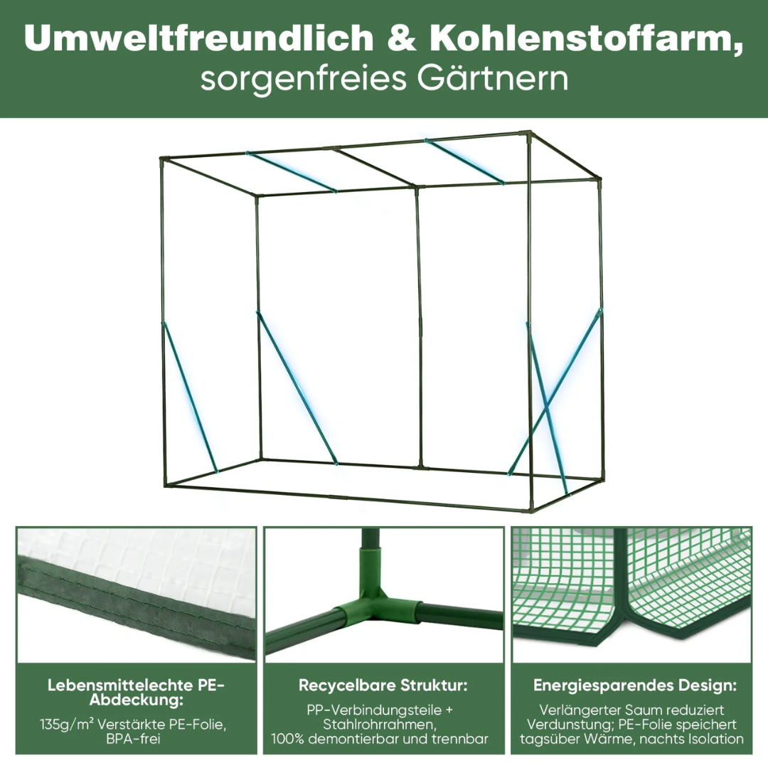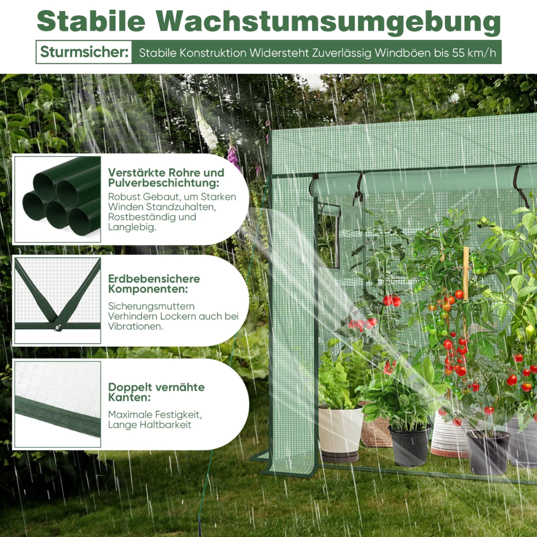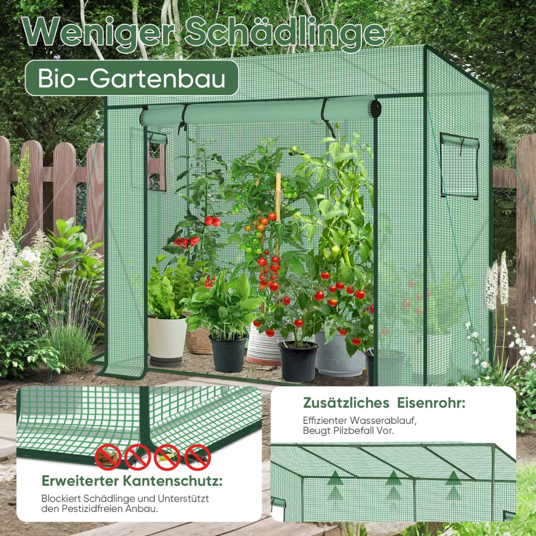 Die hochwertige 140 g/m² PE-Abdeckung ist 100 % wasserdicht, UV-beständig und reißfest. Sie schützt zuverlässig vor Wind und Regen und verlängert so die Gartensaison. Die aufrollbare Tür mit Reißverschluss sorgt für gute Belüftung und einen einfachen Zugang.